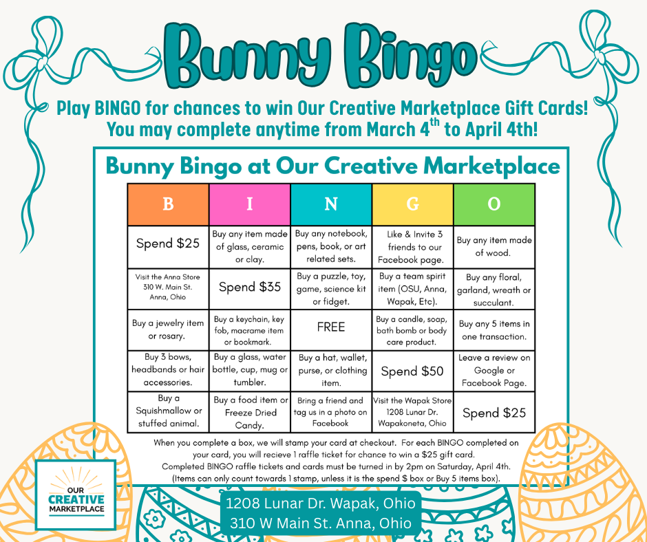 Bunny Bingo ANNA & WAPAKONETA 3/4/2026-4/4/2026 Come grab a bingo card and shop!